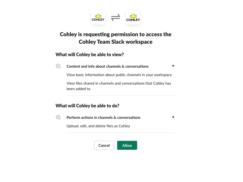 2. Click 'add' next to Slack to authorize Cohley's connection to your Slack workspace