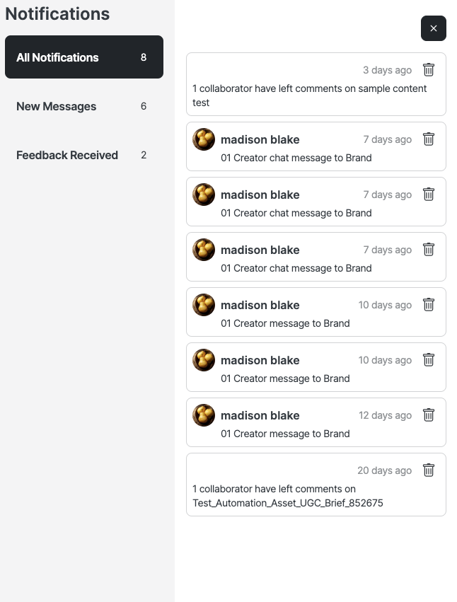 To view the content of the message or respond, click on the individual notification and you will be directed to the Creator chat or the collaboration panel in the brief.