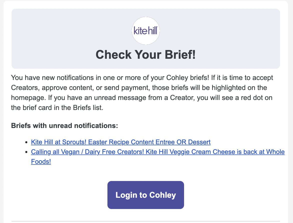 Emails are sent to the main account user Mondays and Wednesdays at 11am ART (hourly difference due to daylight savings) if there is an unread notification. The email will include a list of all briefs with an unread message.